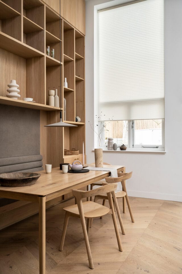 I køkken-alrum kan elektriske gardiner hjælpe med at styre lyset gennem dagen. Du kan nemt justere gardinerne, mens du laver mad eller spiser, uden at skulle gå hen til vinduerne.