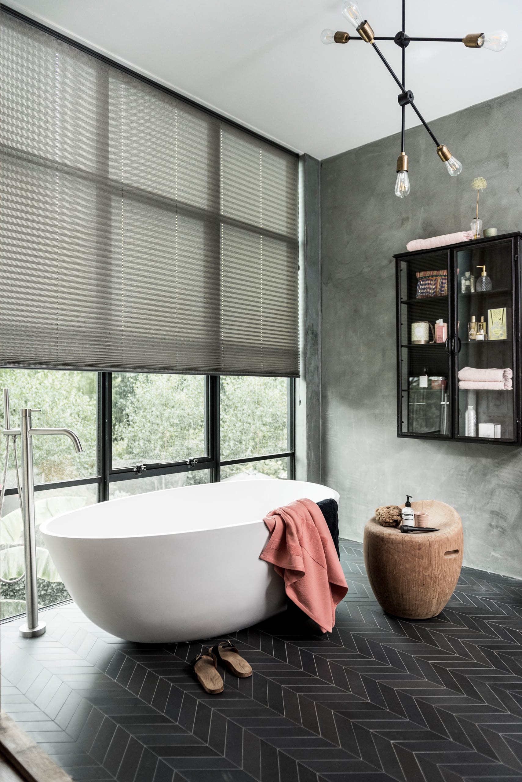 Karins anbefaling: Til badeværelset anbefaler jeg plissegardiner, der tåler fugt og giver privatliv efter behov. De er praktiske og fylder ikke meget, når de er trukket sammen.